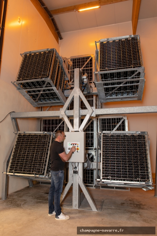 After the second fermentation in the bottle, a deposit of yeast naturally forms. To obtain a clear wine, this deposit must be gradually gathered into the neck of the bottle. Traditionally, bottles were placed upside down on wooden racks, then manually turned by an eighth of a turn every day for several weeks. Today, this operation is mostly carried out using gyropalettes, automated machines capable of riddling several hundred bottles at once with precision and consistency.