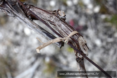 Once pruning is complete, the selected canes are bent and tied by hand to the trellising wires using biodegradable ties. This springtime task ensures proper orientation of the shoots and harmonious distribution of future vegetation. It requires precision and dexterity.