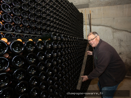 Throughout this step, the bottles are stored lying on their sides, stacked on wooden laths, in the cool, dark stillness of the cellars.